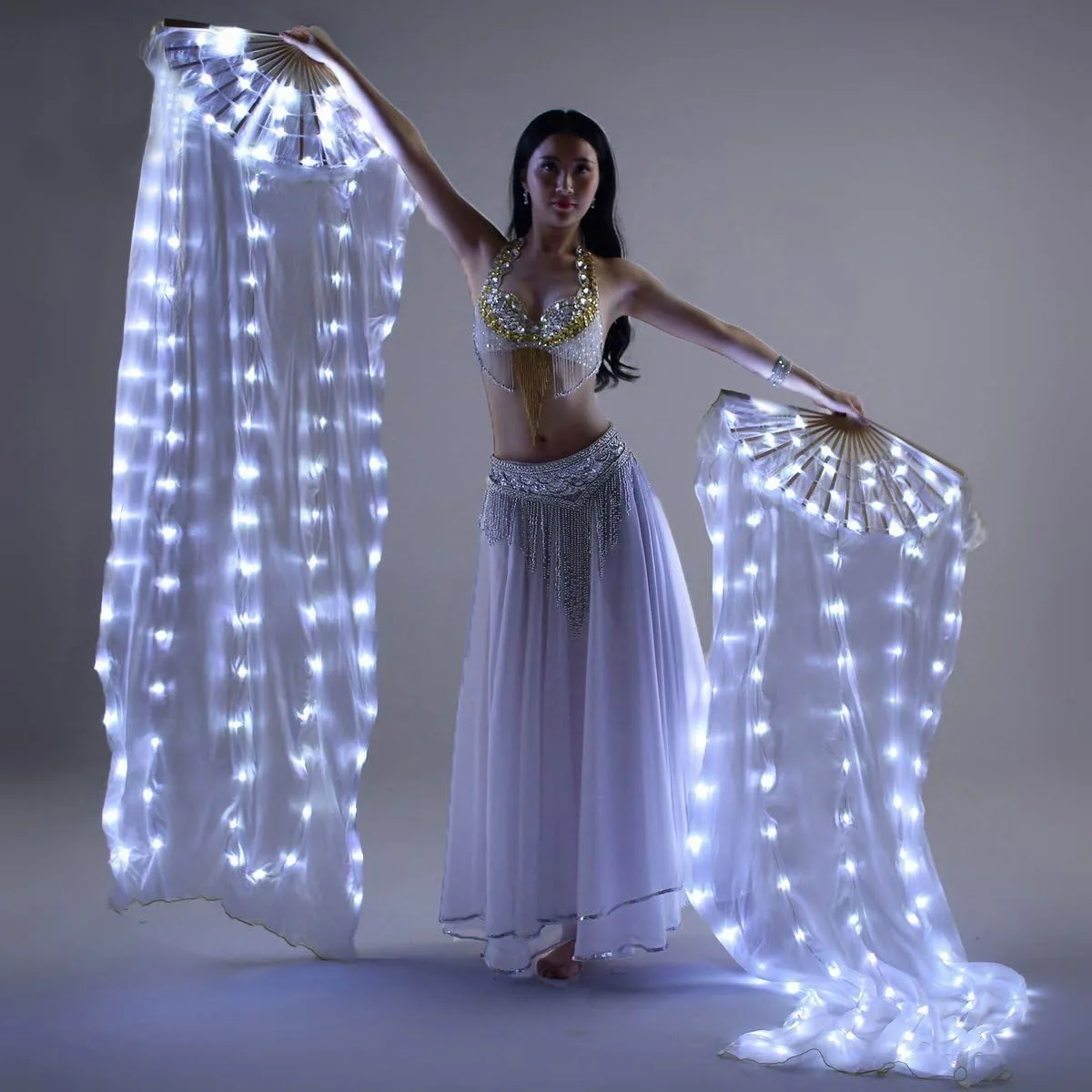 Kolorowy wachlarz LED, idealny do tańca brzucha i występów scenicznych. Wykonany z wysokiej jakości jedwabiu, ma długość 1.5 metra i efektownie rozświetla się podczas tańca. Doskonały wybór dla kobiet, które pragną dodać blasku swoim występom i zachwycić publiczność.