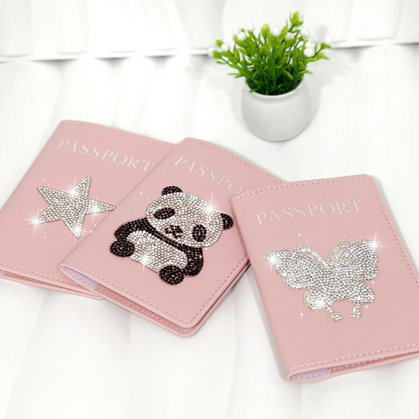 Elegancka i stylowa okładka na paszport z motywem motyla i gwiazd, ozdobiona dżetami. Idealne akcesorium podróżne dla kobiet i dziewcząt, które cenią sobie modny wygląd. Może służyć również jako etui na portfel oraz karty, zapewniając praktyczność i estetykę w jednym.