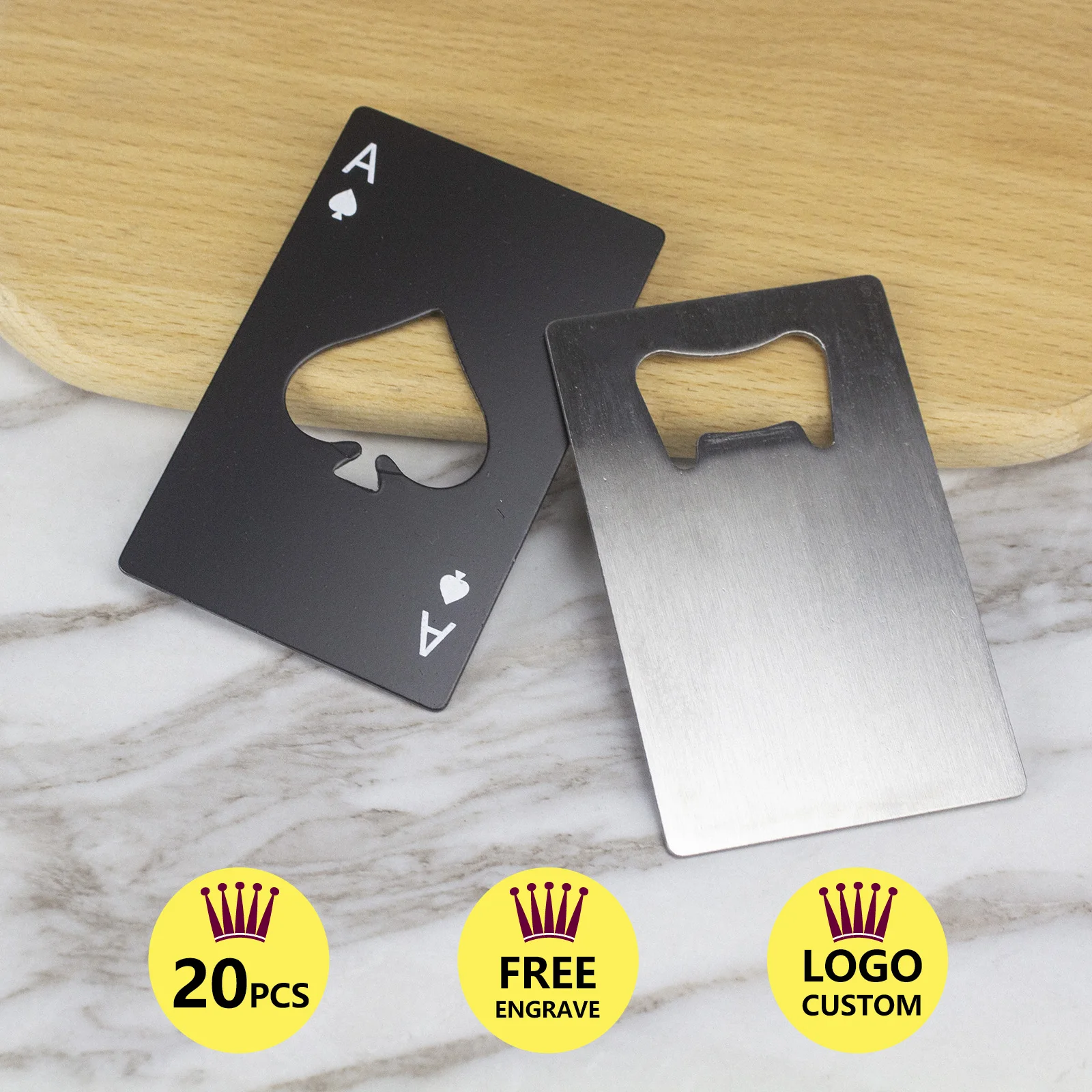Zestaw 20 sztuk otwieraczy do butelek w kształcie karty, wykonanych ze stali nierdzewnej. Idealne do użytku w restauracjach, barach oraz jako spersonalizowany prezent promocyjny. Możliwość grawerowania logo sprawia, że będą doskonałym dodatkiem do różnych wydarzeń i kampanii reklamowych.