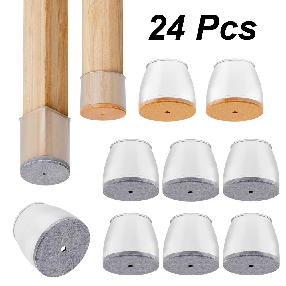 Zestaw 24 okrągłych nakładek na nogi krzeseł wykonanych z matowego silikonu. Idealne do ochrony podłóg przed zarysowaniami oraz redukcji hałasu przy przesuwaniu mebli. Te trwałe i elastyczne ochraniacze są łatwe w montażu i pasują do różnych typów nóg mebli, co sprawia, że są doskonałym rozwiązaniem do każdego domu.