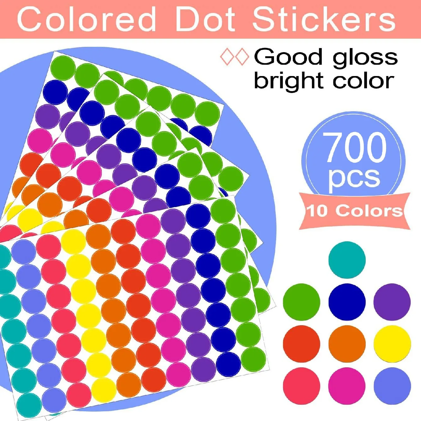 Zestaw 350-700 sztuk samoprzylepnych naklejek w 10 kolorach. Idealne do oznaczania, organizacji lub dekoracji. Każda naklejka ma formę okrągłej etykiety w kolorze białym, co sprawia, że są wszechstronne i łatwe w użyciu. Doskonałe do biura, szkoły oraz w codziennym życiu.