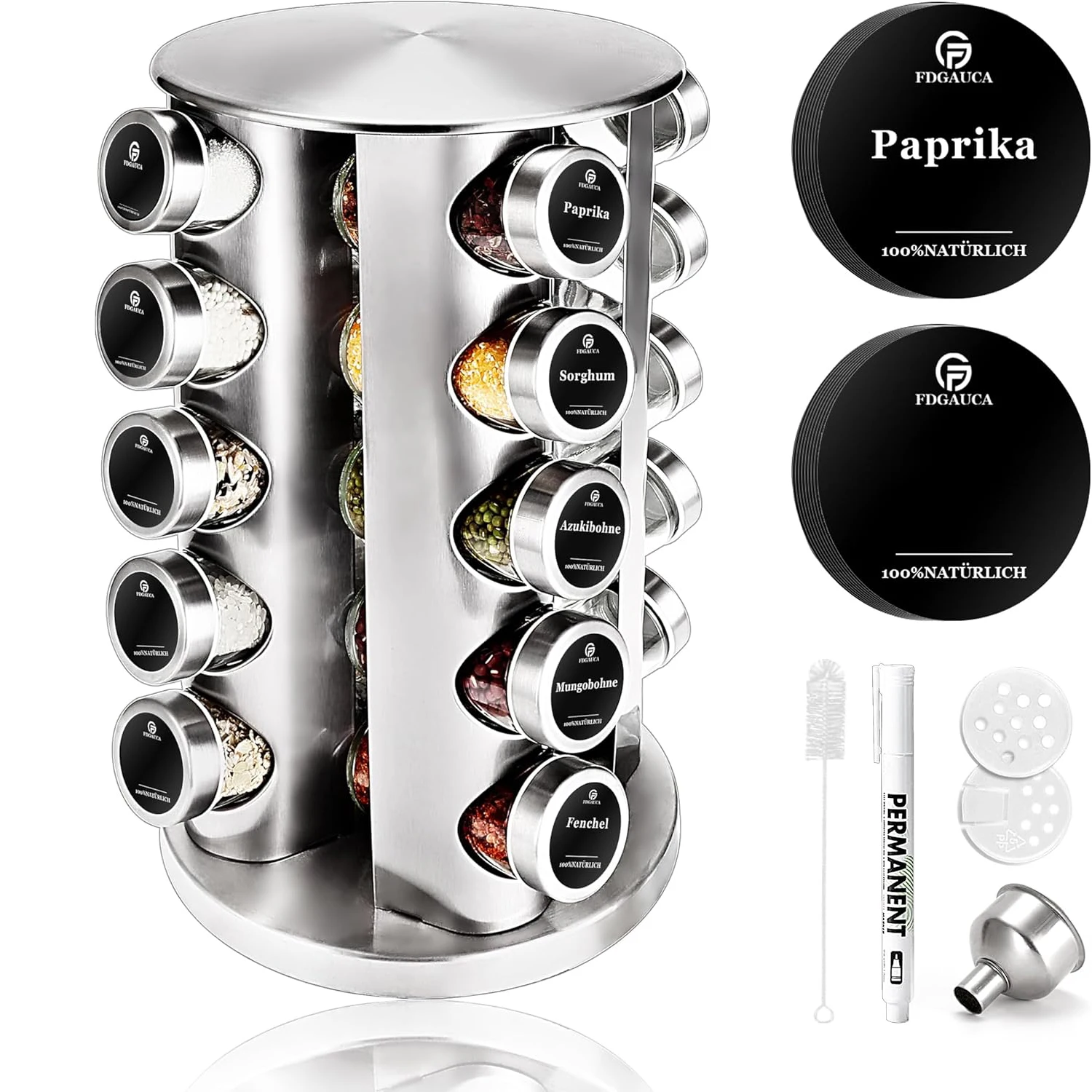 Odkryj nasz innowacyjny 360 ° obrotowy organizer na przyprawy, który pomieści aż 20 słoików o pojemności 100 ml. Dzięki pięciopoziomowej konstrukcji, ten organizer pozwala zaoszczędzić miejsce w kuchni, jednocześnie zapewniając łatwy dostęp do wszystkich Twoich ulubionych przypraw. W komplecie znajdują się niemieckie etykiety, które ułatwią identyfikację zawartości słoików. Idealne rozwiązanie dla każdego, kto pragnie utrzymać porządek w swojej kuchni!