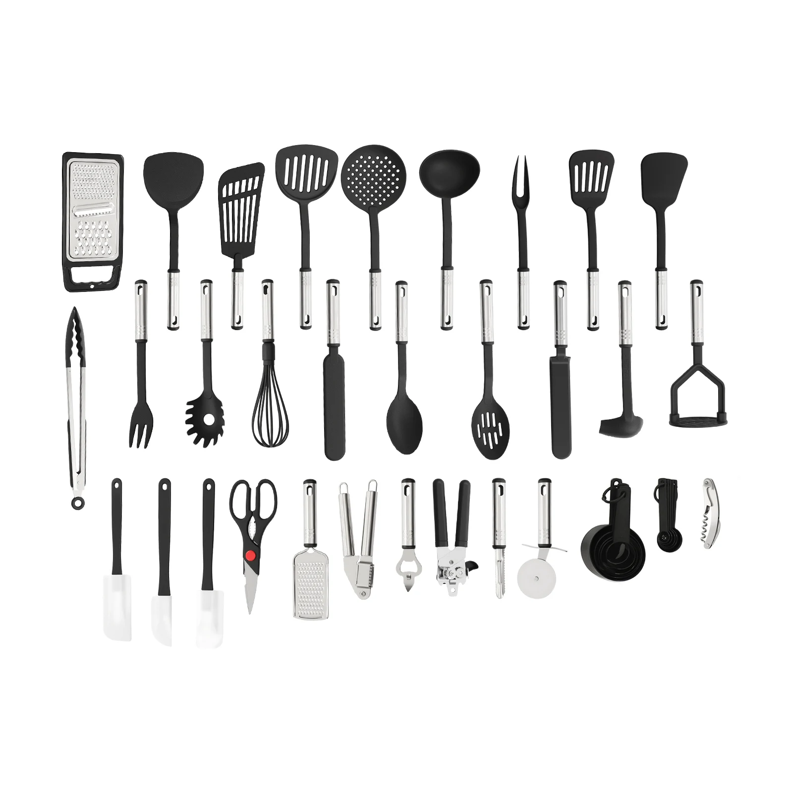 Zestaw zawiera różnorodne narzędzia do gotowania, w tym łopatkę, szpatułkę i chochlę. Wykonany z wysokiej jakości nylonu i stali nierdzewnej, jest odporny na ciepło i nie rysuje powierzchni garnków i patelni. Idealny dla każdego miłośnika gotowania, który ceni sobie funkcjonalność oraz estetykę w kuchni.