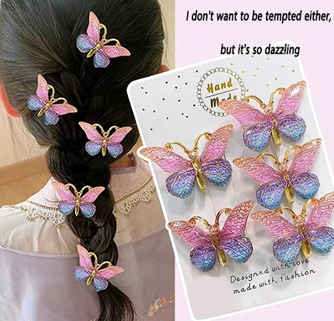 Zestaw 5 słodkich spinek do włosów dla dziewczynek, ozdobionych pięknym gradientowym motywem motyla. Idealne na każdą okazję, dodadzą uroku każdej małej księżniczce. Wykonane z wysokiej jakości materiałów, zapewniają wygodę noszenia i trwałość. Doskonałe jako dodatek do codziennych stylizacji.