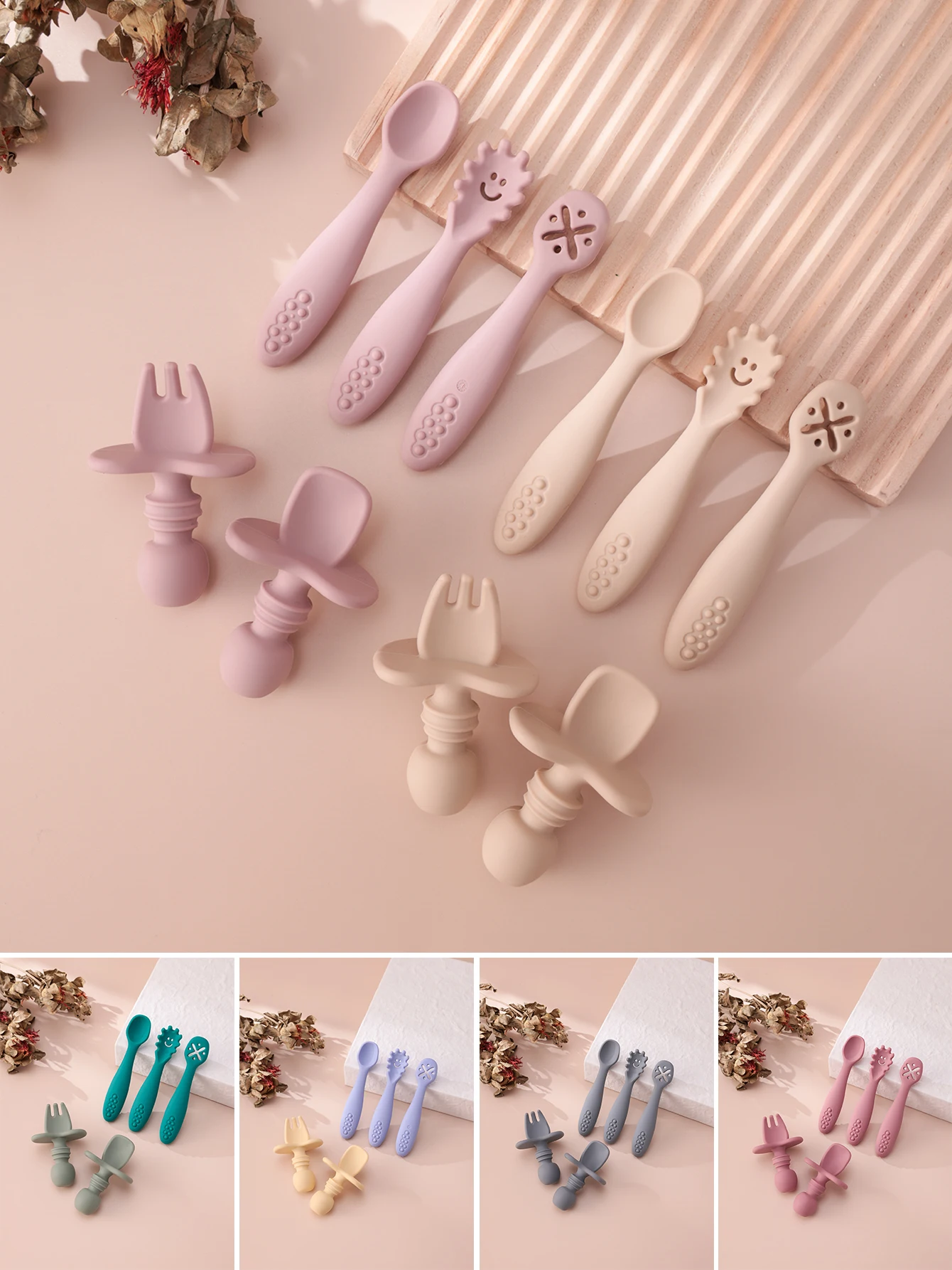 Miękki silikonowy zestaw sztućców składający się z łyżeczki i widelca, idealny dla maluchów. Wykonany z materiałów bez BPA, zapewnia bezpieczeństwo podczas jedzenia. Doskonałe na trening samodzielnego jedzenia dla dzieci. Świetny pomysł na niezbędny prezent na Baby Shower.