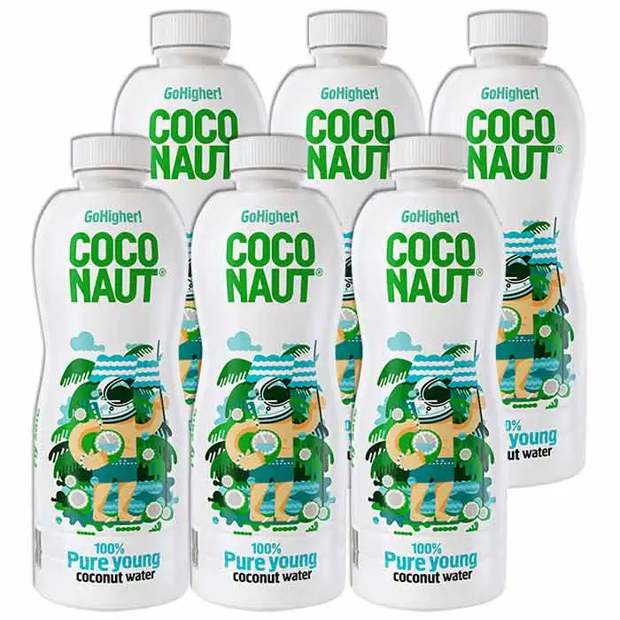 Zestaw 6 butelek wody kokosowej COCONAUT z młodego kokosa o pojemności 1000ml każda. Naturalny, orzeźwiający napój, bogaty w elektrolity i składniki odżywcze. Idealny do nawadniania organizmu, doskonały po treningu lub jako zdrowa alternatywa dla napojów słodzonych.