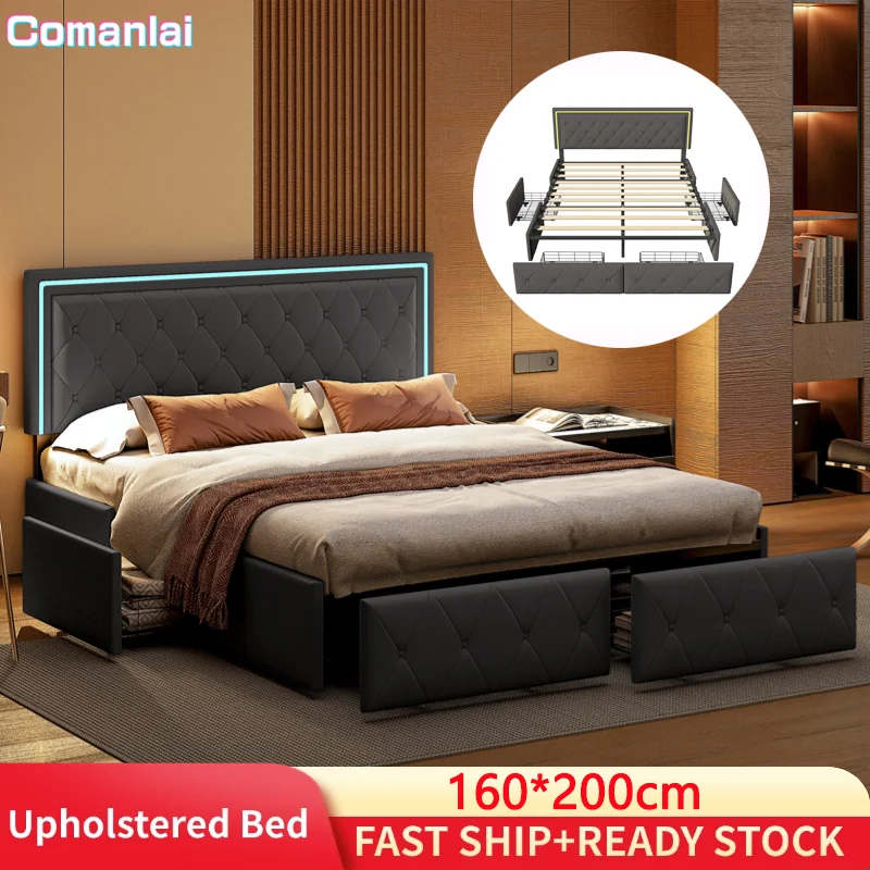 Eleganckie podwójne łóżko tapicerowane o wymiarach 160 x 200 cm, idealne do nowoczesnej sypialni. Posiada praktyczny schowek oraz 4 szuflady, które zapewniają dodatkową przestrzeń do przechowywania. Wyposażone w stylowy zagłówek z podświetleniem LED, wykonane z solidnej drewnianej ramy z listwami. Materiał PU w kolorze szarym nadaje mu elegancki wygląd.