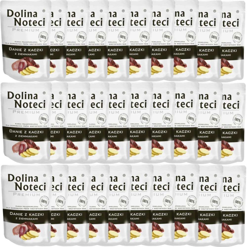 Mokra karma dla psa Dolina Noteci z kaczki i ziemniaków to doskonałe połączenie smaku i wartości odżywczych. Opakowanie zawiera 30 puszek po 300g, co wystarcza na dłużej. Idealna dla psów wszystkich ras, zapewnia odpowiednią dietę i wspiera zdrowie pupila.