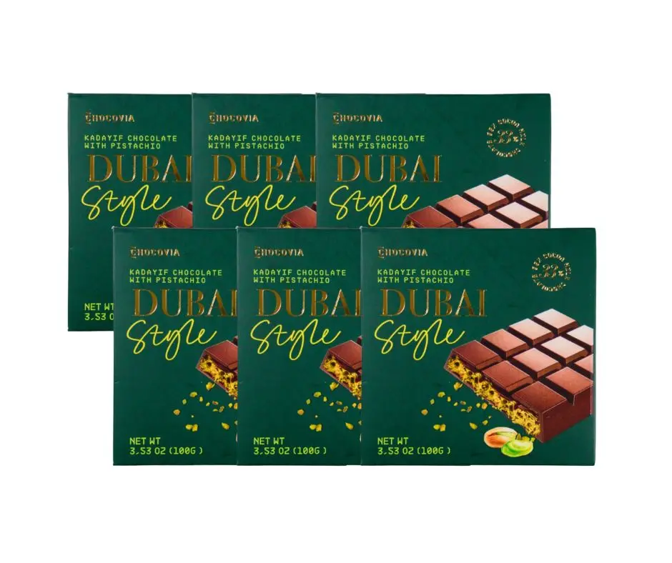 Zestaw wyjątkowych czekoladek w stylu Dubaju, zawierający 6 opakowań po 100g każda. Każda czekoladka łączy w sobie delikatny smak pistacji oraz aromatyczną kunafę, tworząc niezapomniane doznania smakowe. Idealne na prezent lub do samodzielnego delektowania się. Odkryj egzotykę Dubaju w każdej kostce!