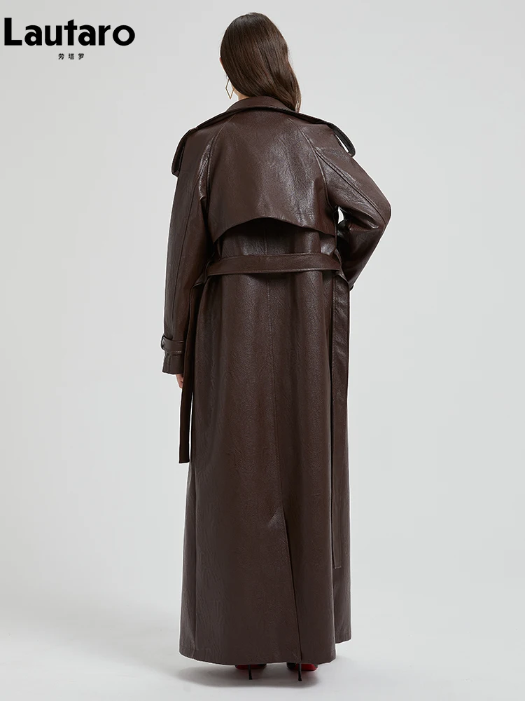 Elegancki trencz w kolorze brązowym, wykonany z wysokiej jakości skóry Pu. Idealny na wiosenne i jesienne dni, zapewnia stylowy wygląd. Płaszcz ozdobiony szarfami, łączy luksus z modą europejską na rok 2024. Doskonały wybór dla kobiet ceniących sobie elegancję i wygodę.
