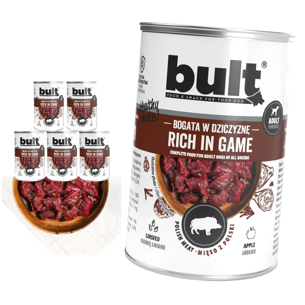 Zestaw 6 puszek mokrej karmy dla psa Bult, bogatej w dziczyznę. Doskonała jakość składników zapewnia pełnowartościowe odżywienie dla Twojego pupila. Karma została stworzona z myślą o psach, które potrzebują zbilansowanej diety oraz smakuje wyśmienicie. Idealna dla psów w każdym wieku.