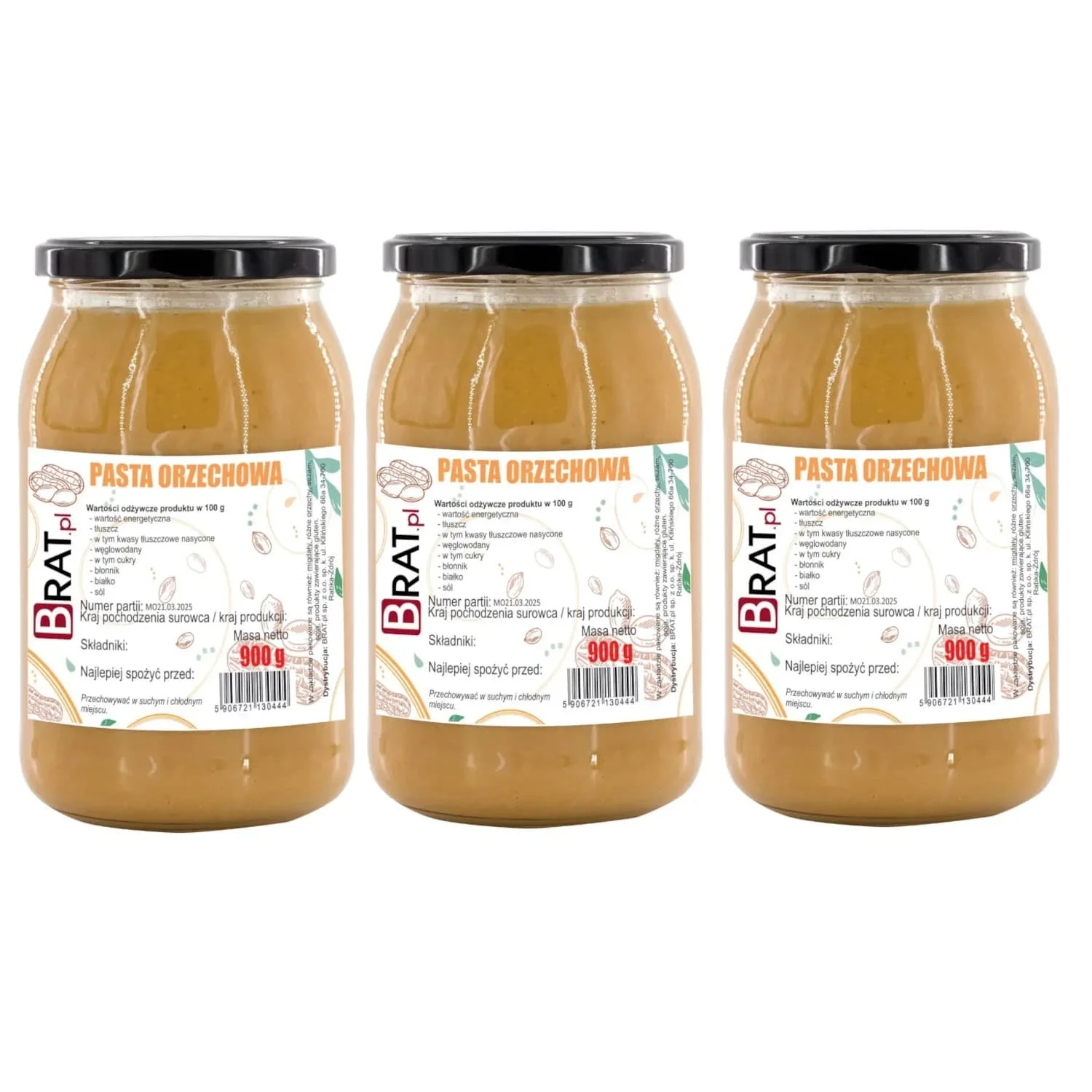 Zestaw trzech opakowań pysznej pasty orzechowej o wadze 900g każda. Idealna do smarowania na pieczywie, jako dodatek do smoothie lub jako składnik zdrowych deserów. Wysokiej jakości składniki, bez dodatku cukru i konserwantów. Doskonała dla miłośników orzechów i zdrowego stylu życia.