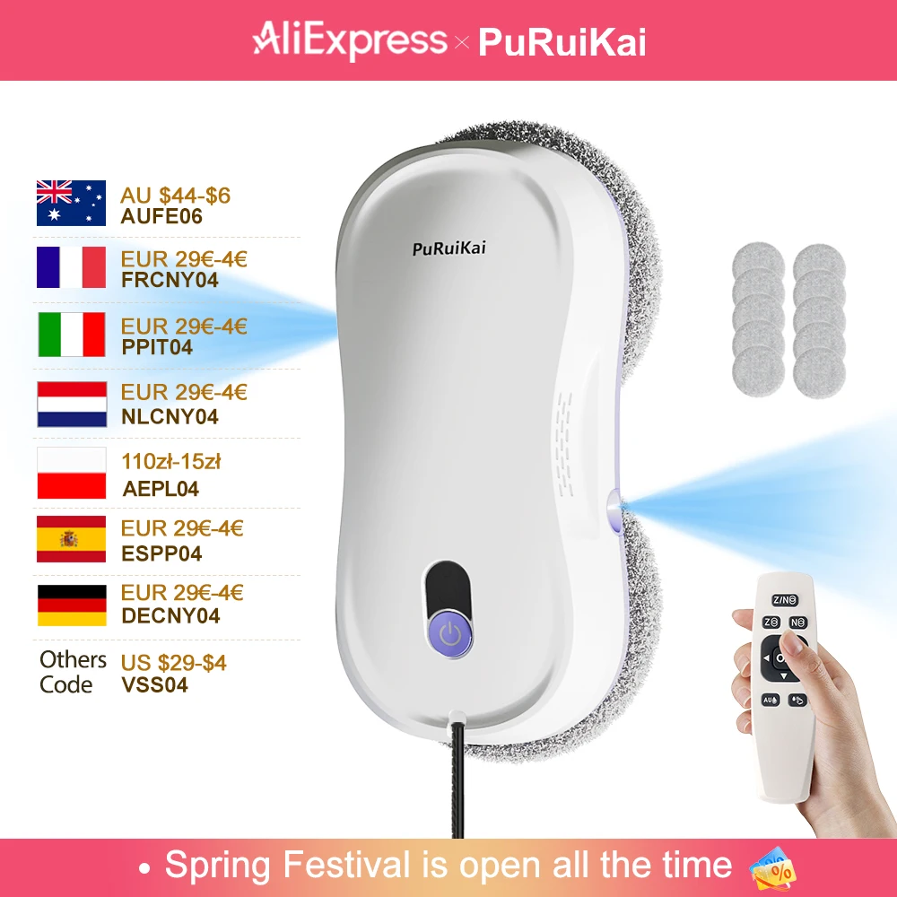 Inteligentny robot do czyszczenia okien PuRuiKai z podwójną dyszą spryskującą. Ułatw swoje codzienne obowiązki dzięki zdalnemu sterowaniu.