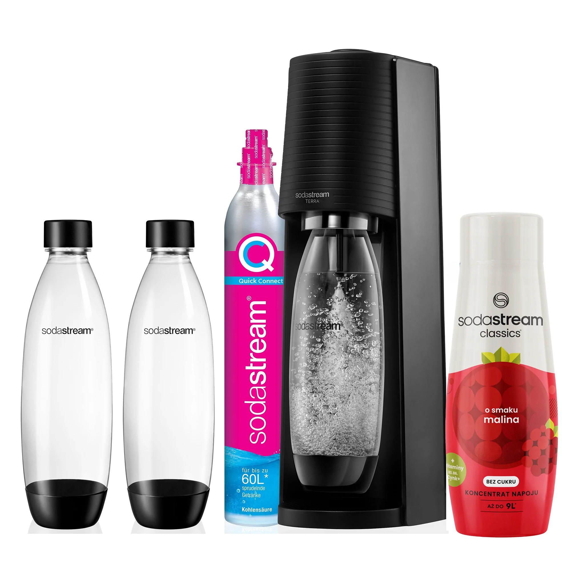 SODASTREAM TERRA to innowacyjny saturator, który pozwala na łatwe i szybkie przygotowanie gazowanej wody w domowym zaciszu. W zestawie znajdują się dwie butelki o pojemności 1 litra, które są idealne do serwowania napojów. Dodatkowo, do zestawu dołączony jest syrop o smaku maliny, który nadaje wodzie owocowy aromat. Dzięki temu produktowi możesz cieszyć się świeżą, gazowaną wodą w ulubionym smaku w każdej chwili!