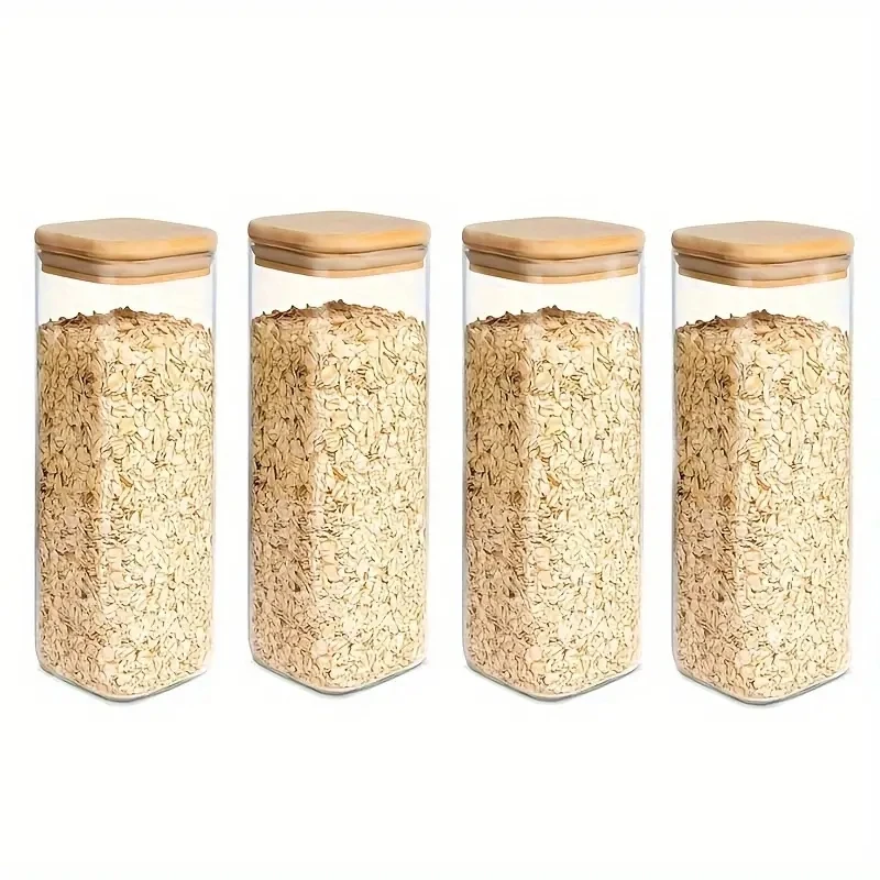 Zestaw szklanych słoików o pojemności 540 ml lub 1000 ml, idealnych do przechowywania żywności. Dzięki przezroczystemu, kwadratowemu kształtowi i szczelnemu zamknięciu, słoiki te doskonale nadają się do przechowywania cukierków, ciastek, ryżu oraz ziół. Elegancki design sprawia, że świetnie prezentują się na blacie kuchennym.