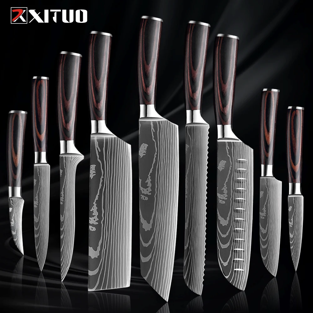 Zestaw noży kuchennych XITUO składający się z 1 do 9 elementów, wykonany ze stali nierdzewnej 7Cr17Mov. Oferuje ostry nóż szefa kuchni, nóż Santoku oraz nóż do owoców. Ergonomiczny uchwyt z Pakkawood zapewnia komfort i bezpieczeństwo podczas krojenia.