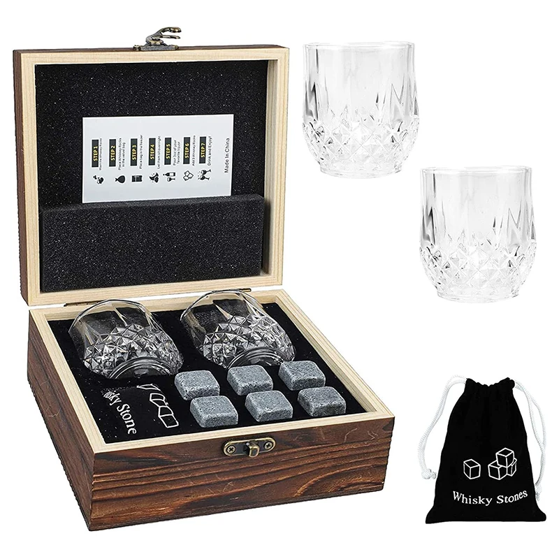 Zestaw Kamieni Granitowych do Whisky z Szklankami i Drewnianym Pudełkiem