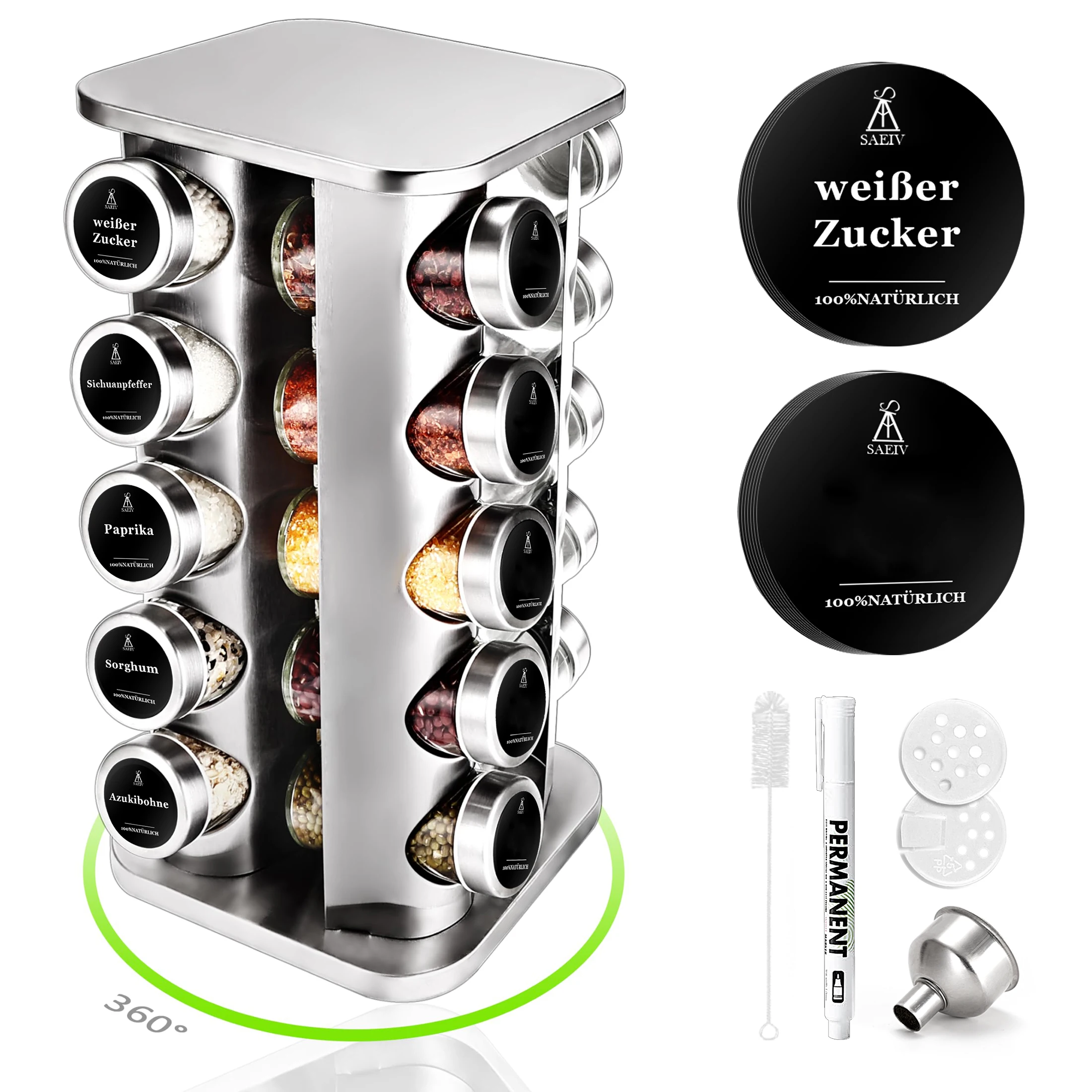 Obrotowy stojak na przyprawy z możliwością obrotu o 360 stopni, wyposażony w 20 okrągłych słoików ze stali nierdzewnej. Każdy słoik posiada szczelną pokrywkę, co zapewnia długotrwałą świeżość przypraw. Idealne rozwiązanie do każdej kuchni, które pozwoli na łatwe przechowywanie i dostęp do ulubionych przypraw.